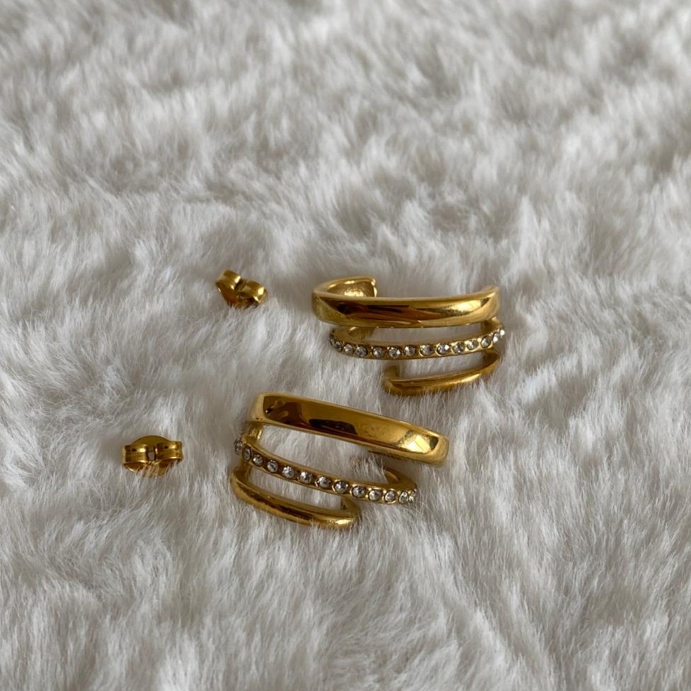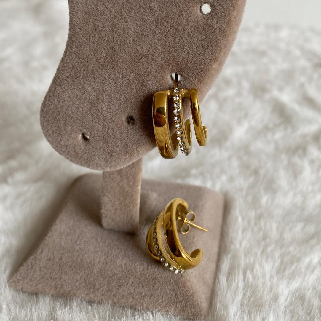 Çelik Gold Rengi Zirkon Taşlı Üçlü Halka Küpe