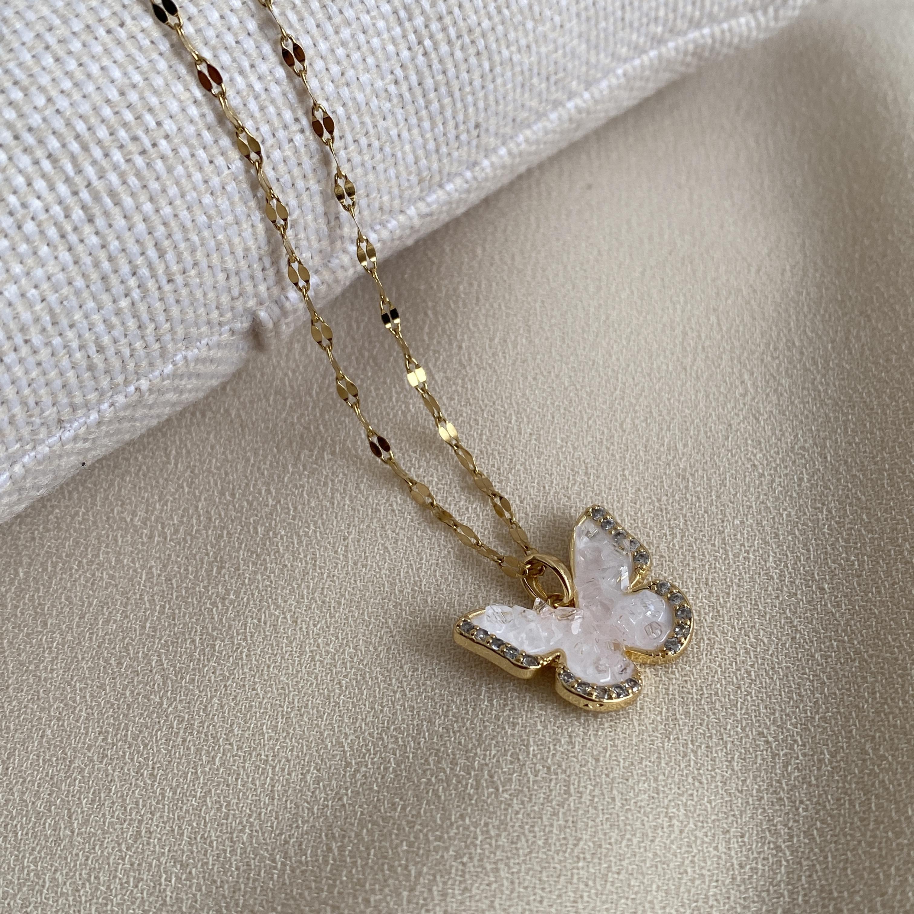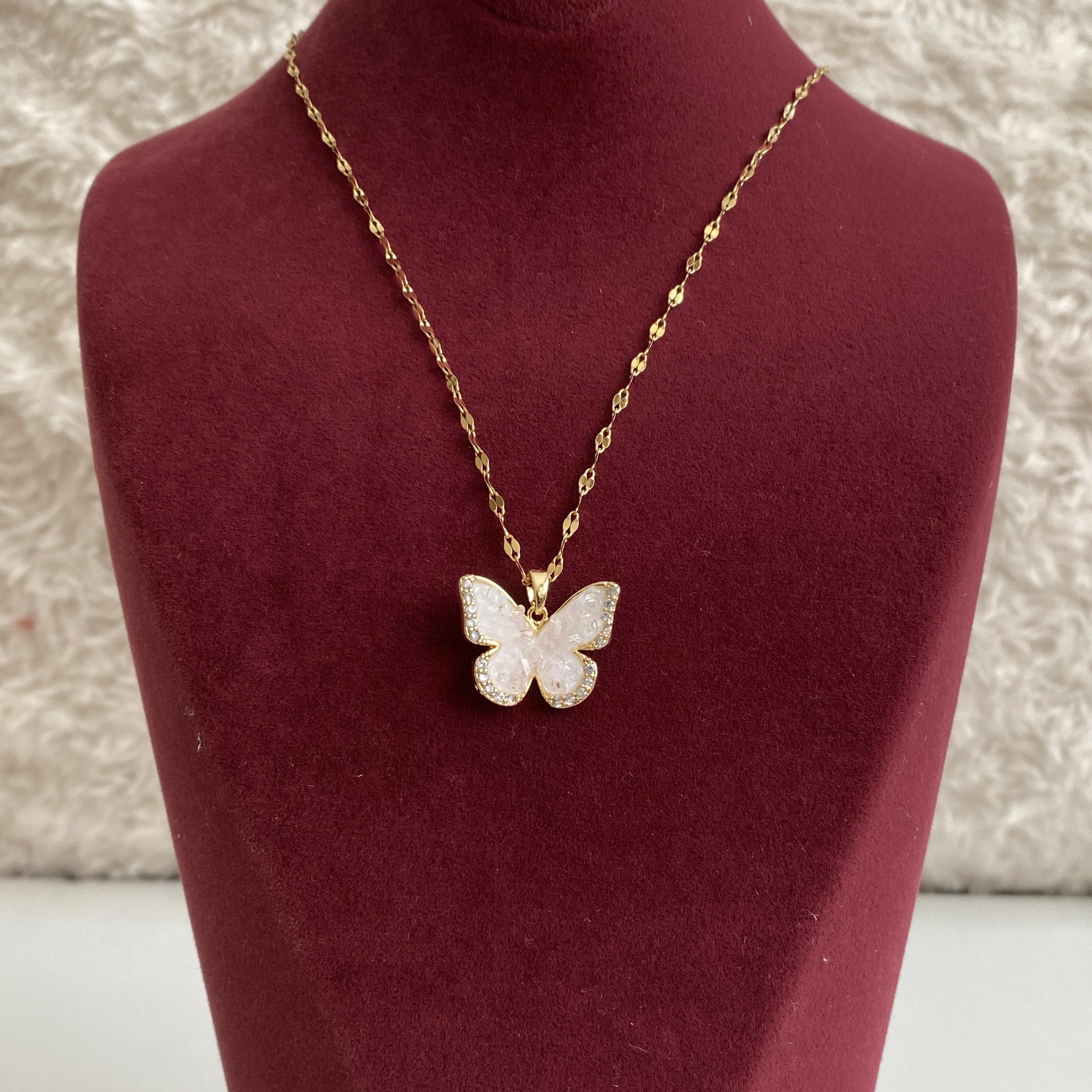 Çelik Sedef Rengi Zirkon Taşlı Kelebek Kolye